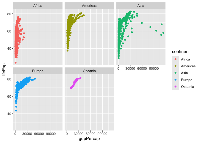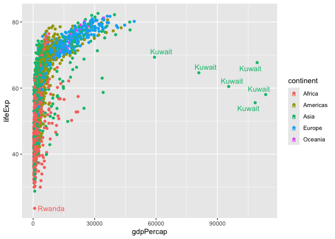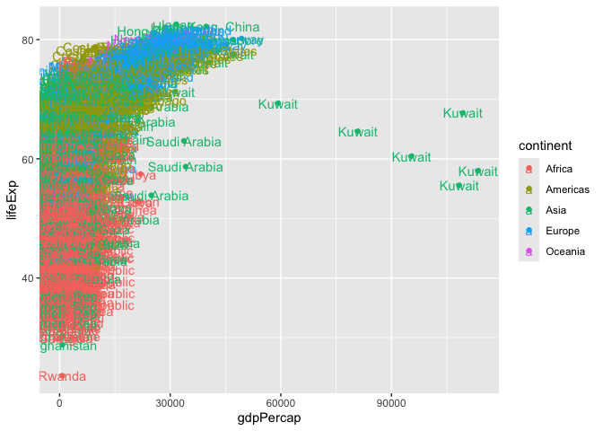 aes(gdpPercap, lifeExp, col=continent, label=country) +
