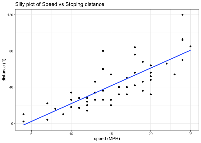 Add a line showing the relationship between x and y Add a title Add custom axis labels “Speed (MPH)” and “Distance (ft)” Change the theme…