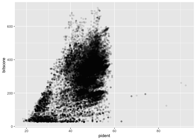 ggplot(b, aes(pident, bitscore)) + geom_point(alpha=0.1)