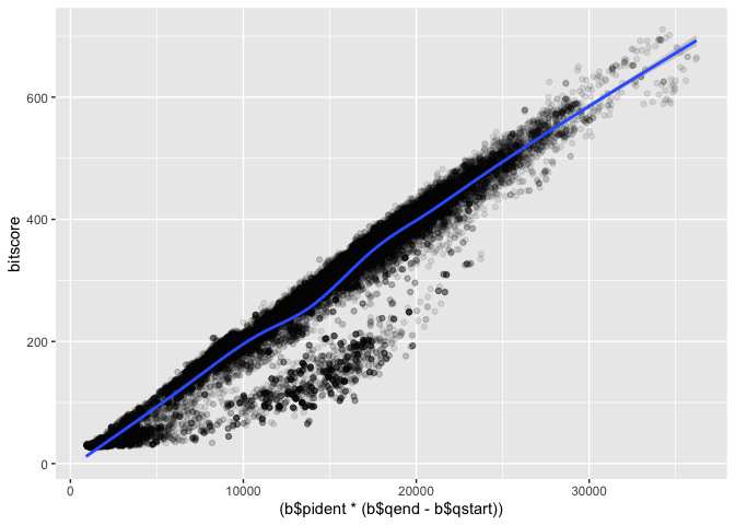 ggplot(b, aes((b$pident * (b$qend - b$qstart)), bitscore)) + geom_point(alpha=0.1) + geom_smooth()